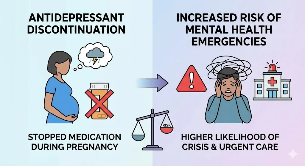 In this cross-sectional analysis, discontinuation of SSRIs or SNRIs during pregnancy was associated with a substantially increased risk of acute mental health emergencies. These findings suggest that routine discontinuation of antidepressants during pregnancy may pose significant maternal risks and underscore the importance of individualized risk-benefit counseling and policies that support continued treatment when clinically appropriate.