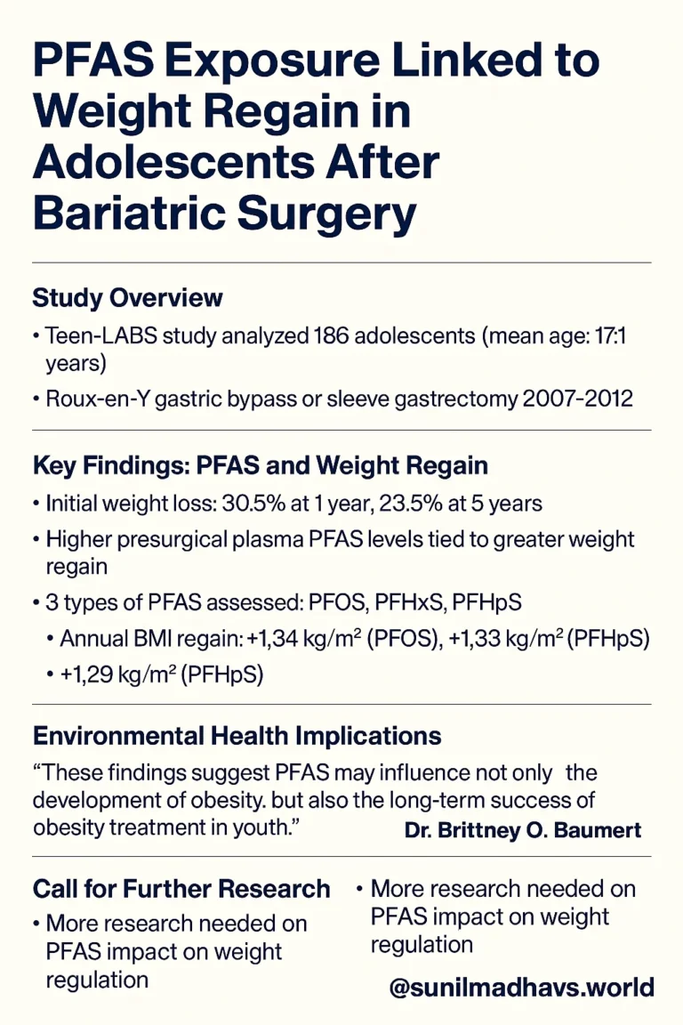 A recent study published in *Obesity* suggests that teenagers undergoing bariatric surgery tend to regain more weight if they have elevated levels of PFAS in their bloodstream before surgery. These findings come from the Teen-LABS study, which tracks the long-term effects of bariatric surgery in patients 19 years and younger.