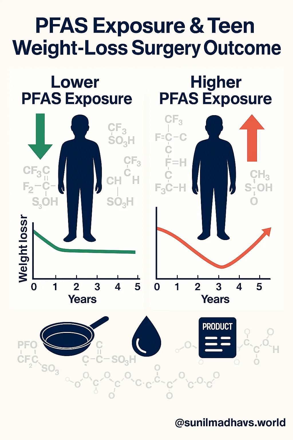 A recent study published in *Obesity* suggests that teenagers undergoing bariatric surgery tend to regain more weight if they have elevated levels of PFAS in their bloodstream before surgery. These findings come from the Teen-LABS study, which tracks the long-term effects of bariatric surgery in patients 19 years and younger.