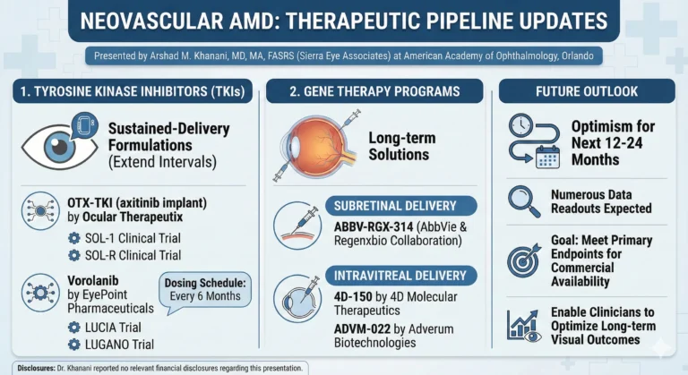 At the American Academy of Ophthalmology meeting in Orlando, Arshad M. Khanani, MD, MA, FASRS (Sierra Eye Associates), highlighted significant advancements in the therapeutic pipeline for neovascular AMD. His presentation focused on two primary classes of emerging treatments: Tyrosine Kinase Inhibitors (TKIs) and gene therapies.