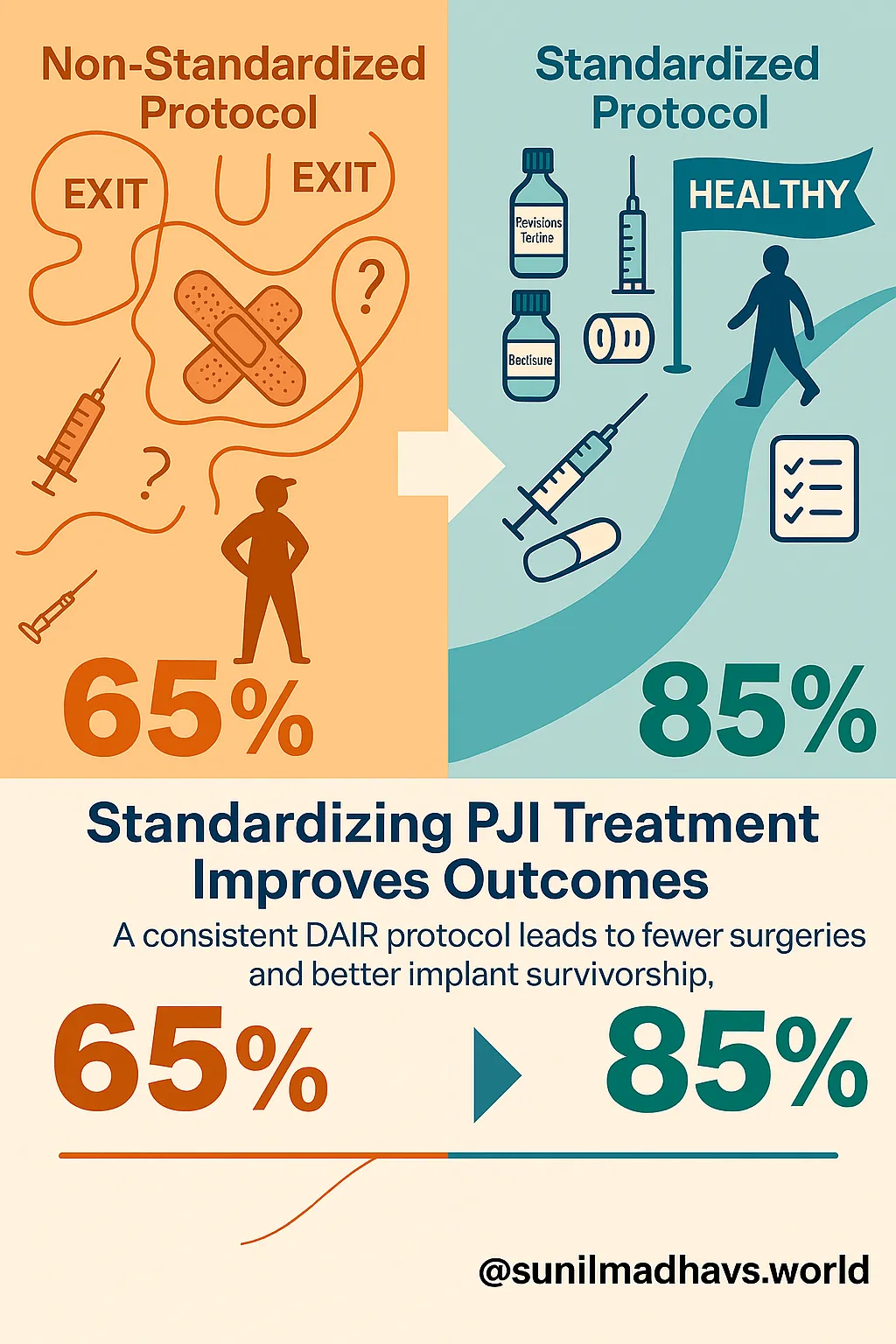 This difference translated into a significantly higher implant survivorship rate for patients in the standardized DAIR group. The results suggest that the consistent use of antiseptic solutions and a structured, repeatable process can have a meaningful impact on long-term surgical outcomes.