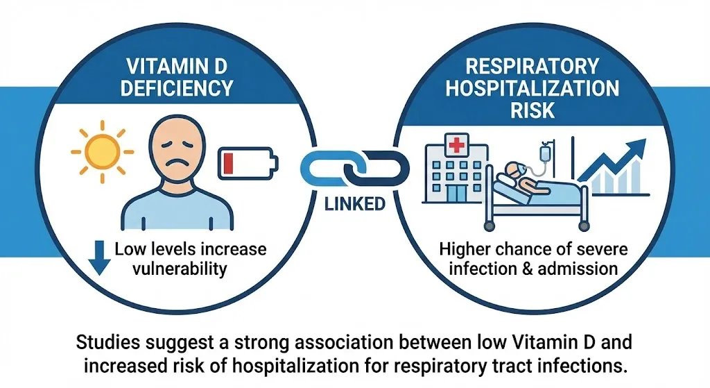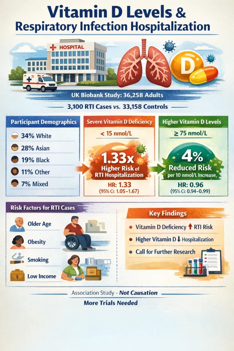 Vitamin D plays a critical role in musculoskeletal health and immune function. Increasing evidence suggests that its antibacterial and antiviral properties may influence susceptibility to respiratory tract infections (RTIs), which remain a major cause of hospitalization worldwide. Despite biologic plausibility, robust population-level data linking vitamin D status to RTI-related hospitalizations have been limited.